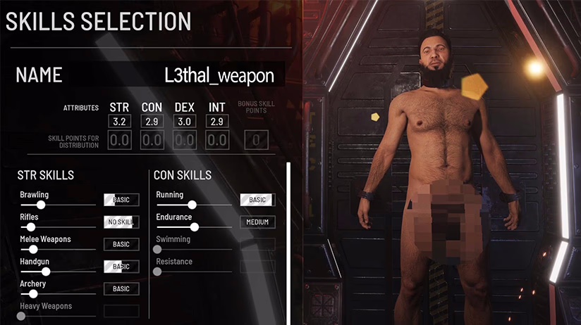 Assign skill points to your starting character. Go for an all rouder or a specialist. Start out as a physical beast with low intelligence? You can level this up later through your play.